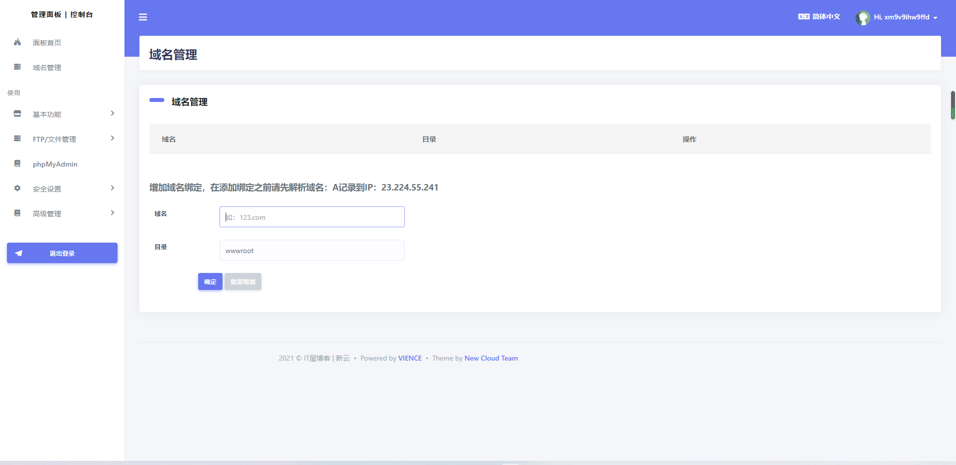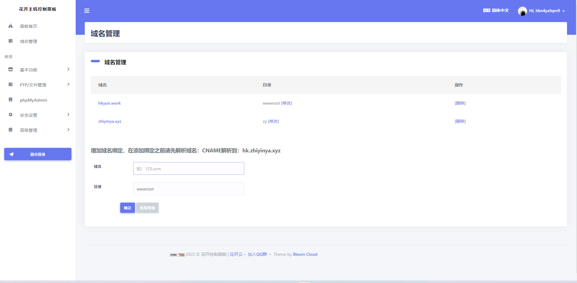 在第一个域名框中填入你申请到的域名,在第二个目录框中填入wwwroot/{此处填入你解压出来的文件名}/,点击确定