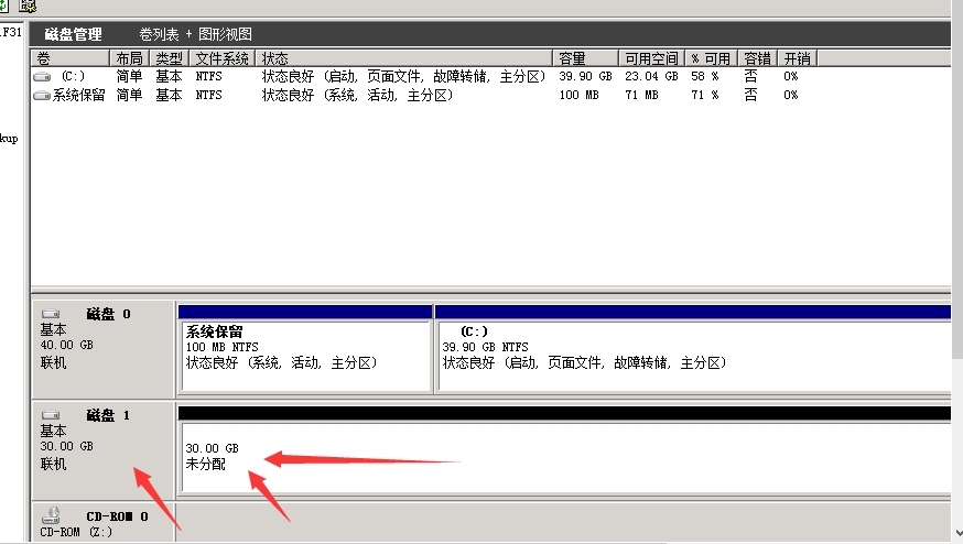 3、打开后如果有多余的磁盘会自动弹出来,有时候磁盘没有联机,这个是联机了,如果没有联机,在此处右键,选择联机即可,如果未弹出,找到未分配的磁盘,右键点创建,全部下一步,完成。