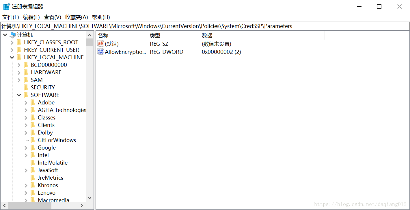 然后在Parameters文件夹内,新建 DWORD(32)位值(D),文件名为 AllowEncryptionOracle ,值为2