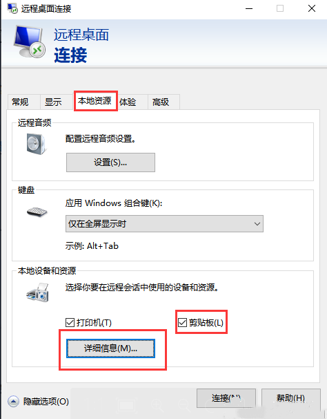 1.启动Windows的远程桌面连接,点选本地资源,确认下剪贴板是勾选状态,并点选详细信息勾选驱动器的本地磁盘